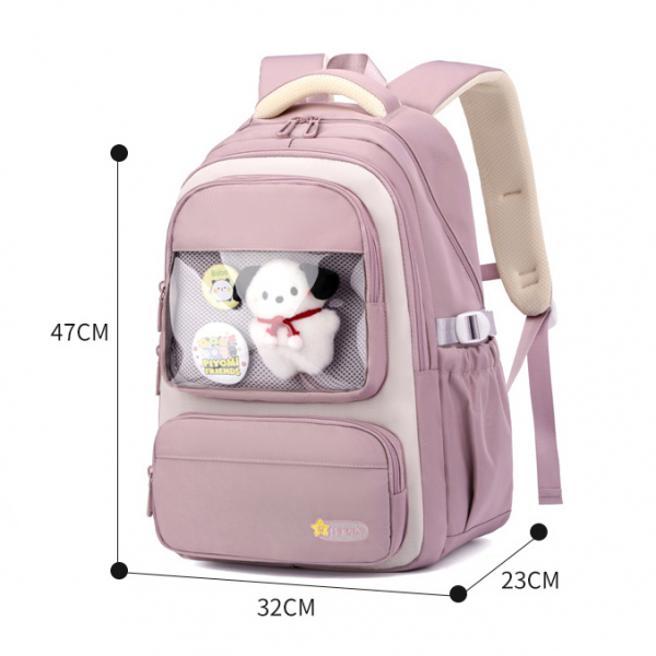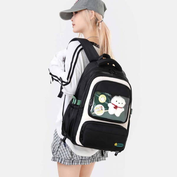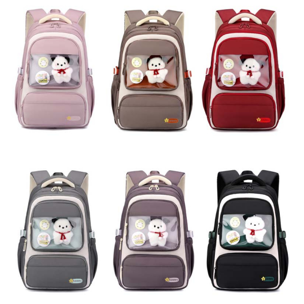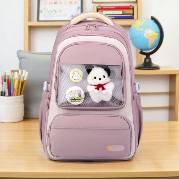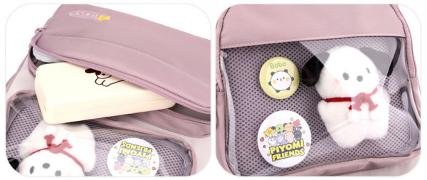 - Thiết kế độc đáo với lớp lưới trong suốt phía trước chứa gấu bông dễ thương kèm huy hiệu hoạt hình, tạo điểm nhấn nổi bật